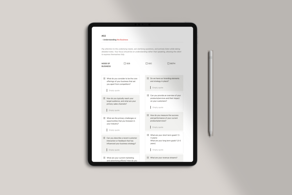 Whether you’re a freelancer, designer, marketer, or creative agency — asking the right questions sets the tone for the entire project. This template ensures you walk into every client call prepared, professional, and focused.